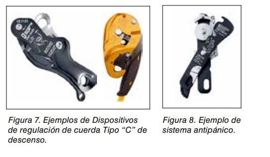 El dispositivo de regulación de cuerda Tipo C, también denominado dispositivo de descenso, es un dispositivo de regulación por rozamiento para la cuerda de trabajo accionado manualmente, que permite al usuario conseguir un movimiento de descenso controlado y una parada, sin manos, en cualquier punto de dicha cuerda. Permiten por tanto, descender de forma controlada por la cuerda de trabajo. El descenso se produce al accionar una palanca que libera parcialmente la presión sobre la cuerda, El bloqueo automático permite además que se detenga por sí mismo en caso de que el usuario libere la presión al soltar la palanca involuntariamente. Debe ser compatible con el tipo de cuerda y con el diámetro de la misma siguiendo las instrucciones del fabricante. Tiene la consideración de EPI. Ver figura 7.