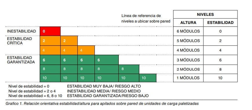 En dicho gráfico se puede ver como hasta tres niveles (color verde), el apilado es seguro, para el cuarto y quinto nivel (color amarillo), el apilado está comprometido, mientras que a partir del sexto nivel (color rojo), el apilado es inestable y tiene un máximo riesgo de desplome.