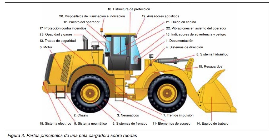 Las partes principales de una pala cargadora de ruedas se pueden ver en la figura 3.