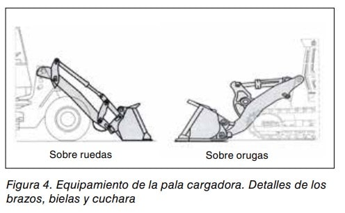 El equipamiento de las palas cargadoras descritas, consiste en unos brazos cargadores, bielas de transmisión articuladas y de una cuchara de carga que presentan pequeñas diferencias según se muevan mediante ruedas u orugas. Ver figura 4.
