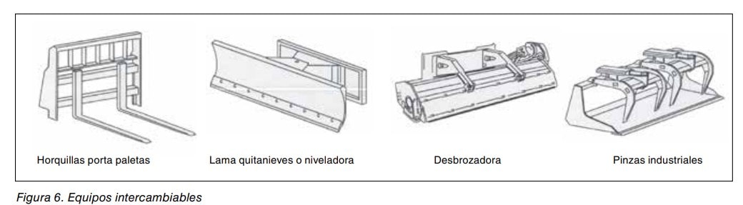 - Equipos intercambiables tales como: horquillas para paletas, lamas quitanieves o niveladoras, pinzas industriales, desbrozadoras, etc., que modifican la función base del equipo. Ver figura 6.