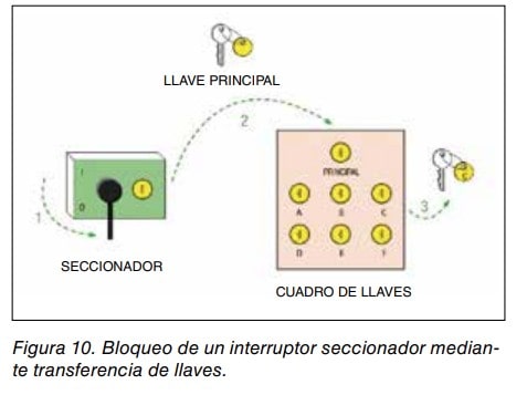 Terminadas las labores y una vez insertadas de nuevo todas las llaves secundarias en su posición de origen, es posible retirar la llave principal, y con ella colocada y girada de nuevo en el seccionador, desbloquearlo y permitir su cierre.