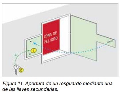 - Dispositivos de enclavamiento por transferencia de llave en la que una de las cerraduras sirve para bloquear el dispositivo de separación; (ver figura 10). En primer lugar se realiza la apertura del seccionador (1). Esto permite girar y retirar la llave principal, quedando bloqueado el seccionador en la posición “0”. Al insertarla y girarla en el cuadro de llaves secundarias (2) permite la liberación de éstas (3), por si deben intervenir varios operarios durante las labores de mantenimiento o para acceder con ellas a otras partes de la máquina protegidas mediante resguardos móviles bloqueados con estas llaves, quedando bloqueada la llave principal. Es recomendable que la llave secundaria también quede bloqueada en la cerradura del resguardo correspondiente, cuando éste permanezca abierto (4) y que sea preciso cerrar dicho resguardo para liberarla, especialmente cuando el resguardo no disponga de enclavamiento. (ver figura 11).