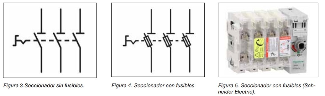 - b) Seccionador, con o sin fusibles, de acuerdo con la Norma UNE-EN 60947-3 (CEI 60947-3), equipado con un contacto auxiliar que provoca en todos los casos el corte del circuito de alimentación por los dispositivos de conexión antes de la apertura de los contactos principales del seccionador. Ambos tipos no pueden abrirse en carga, por lo que previamente se debe desconectar la alimentación de todas las cargas, mediante un contacto auxiliar asociado al propio seccionador, que controla los contactores de potencia. Ver figuras 3, 4 y 5.