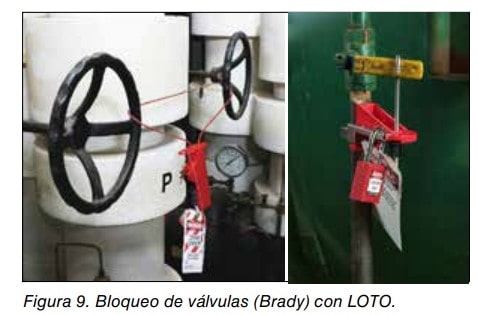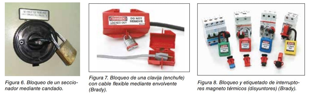 - Dispositivos que pueden emplear uno o varios candados; (ver figuras 6, 7 y 8). En la figura 7 se ha bloqueado y etiquetado la envolvente de una clavija y en la figura 8 se han bloqueado y etiquetado diferentes interruptores magneto térmicos (Lockout/ Tagout). El término Lockout /Tagout abreviado LOTO, procede de una norma OSHA (Occupational Safety and Health Administration) del Departamento de Trabajo de Estados Unidos, sobre desactivación de máquinas para realizar labores de revisión y mantenimiento en las mismas y consiste en bloquear los dispositivos de corte de alimentación de la energía de una máquina en la posición de corte (Lockout) y proceder a su etiquetado (Tagout) para advertir de que la máquina está fuera de servicio. Es un procedimiento semejante a la consignación normalizada en la Unión Europea, siempre que se acompañe de la disipación o de la retención de la energía peligrosa acumulada, cuando proceda, así como de la verificación de que se ha producido el efecto deseado. Hay que destacar que el simple etiquetado del órgano de accionamiento de un dispositivo de corte de alimentación de energía de una máquina en la posición de corte, sin su bloqueo, como se ha observado en alguna ocasión, no equivale a la consignación de la misma. (Ver figura 9).