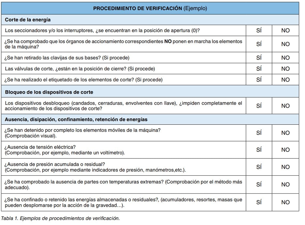 Es recomendable disponer de un procedimiento de trabajo personalizado para cada máquina y facilitado por el fabricante de la misma o elaborado con la ayuda de las indicaciones incluidas en su manual de instrucciones, que defina de forma clara y sin ambigüedades, la secuencia de acciones a llevar a cabo para la retirada o el confinamiento de las energías de una máquina. En la tabla 1 se indican, a modo de ejemplo, algunos de los puntos que deberían ser comprobados y registrados, cuando proceda, según el equipo del que se trate: