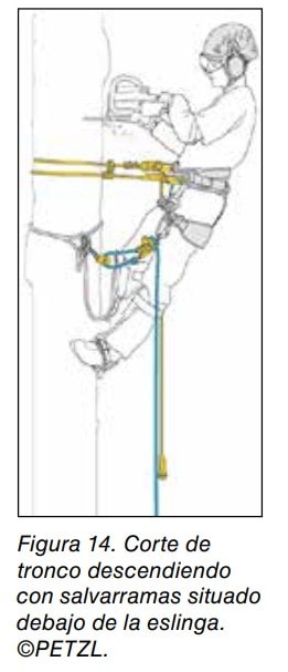 - Cortar el tronco a medida que se desciende para abatir el árbol en pequeños trozos. Es una de las situaciones más complicadas ya que el trepador va cortando la parte del árbol que está por encima de él. Se puede evaluar utilizar la opción a) colocando la cuerda en un árbol vecino o en una estructura existente o generada contigua (p.ej.un edificio al lado del árbol).La opción b) sería utilizable bajo la misma condición. La segunda opción es utilizar la opción d), y por lo tanto colocar un salvarramas que estrangule el tronco. En este caso el salvarramas se colocará por debajo de la eslinga armada de manera que quede protegido de un posible corte. En la utilización de técnicas de trepa la unión entre la eslinga y el arnés se suele hacer con la cuerda de trabajo unida al puente o anclaje ventral del arnés. Si se aplican técnicas básicas de altura es aconsejable unir al salvarramas un absorbedor de energía con sistema de amarre de cable de longitud no superior a 0,5 m conectado al anclaje esternal o dorsal del arnés. Ver figura 14.