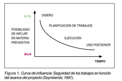 Por todo lo indicado, la integración efectiva de la prevención en la fase de diseño de la obra permitirá aprovechar el potencial preventivo de esta etapa inicial para conseguir la mejora de las condiciones de trabajo en las etapas posteriores de ejecución, operación y/o mantenimiento. Así, y tal y como se refleja en la curva de influencia en la seguridad a lo largo del ciclo de vida de un proyecto (Figura 1), la posibilidad de influir en materia preventiva disminuye de manera notoria según nos alejamos de la fase de diseño y nos acercamos a la de ejecución. Adicionalmente, hay que tener en consideración que, no en pocas ocasiones, el coste asociado a los eventuales cambios a realizar se incrementa a medida que va avanzando el proceso.