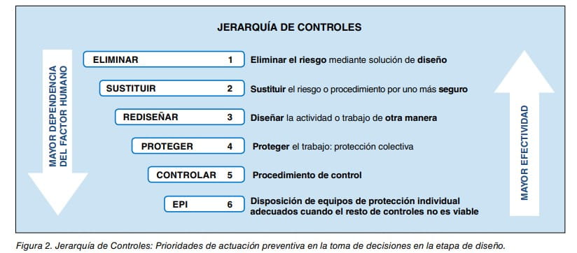 - La toma de decisiones que se efectúa en la etapa de diseño, debe incorporar la Jerarquía de Controles como criterio de análisis comparativo entre las posibles soluciones a adoptar. La aplicación de dicha Jerarquía, cuyo orden de prioridades resulta coherente con los principios de acción preventiva establecidos en la LPRL, supone que, en los procesos de organización, análisis de procedimientos constructivos y/o planificación de los trabajos, se prioricen aquellas soluciones que permiten la eliminación de los riesgos laborales más relevantes en términos de frecuencia y gravedad. La aplicación de esta jerarquía de controles en el proceso de diseño permite, a la postre, mejorar las condiciones de trabajo en la ejecución de los trabajos diseñados a la vez que se limitan los riesgos y priorizan las medidas preventivas de mayor efectividad.