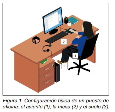A la hora de sentarse para trabajar con ordenadores, hay fundamentalmente tres zonas de contacto físico directo de la persona con el mobiliario y el entorno (ver figura 1): el asiento (1), la mesa (2) y el suelo (3).