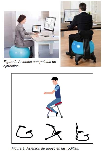 Alguna de estas alternativas llamadas “asientos ergonómicos” son: pelotas de ejercicio (ver figura 2) y asientos de apoyo en las rodillas “kneeling chairs” (ver figura 3). En ambos casos, se puede lograr una postura similar a la postura neutra que sirve de referencia para la regulación de la silla de trabajo, pero presentan una serie de inconvenientes, que hacen que actualmente no sean alternativas adecuadas para trabajos en puestos de oficina con un uso continuado.