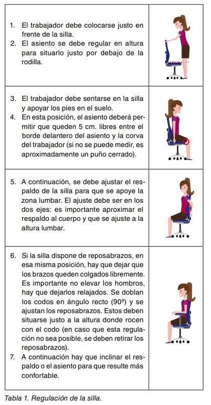 Puesto que la zona de regulación imprescindible es el asiento, es fundamental hacer una buena selección y posteriormente ajustar de forma adecuada la silla de trabajo.