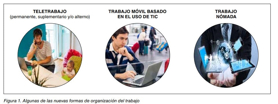 Las nuevas formas de organización del trabajo, reflejadas en la figura 1, quedan circunscritas al término eWork, concepto más amplio que el inicial de telecommuting ya que es aplicable a “cualquier forma de organización del trabajo remoto (es decir, el realizado a distancia, lejos de las instalaciones del empresario) y tele-mediado (en el que la comunicación, transferencia de datos y resultados se lleva a cabo a través del uso de TIC)”.