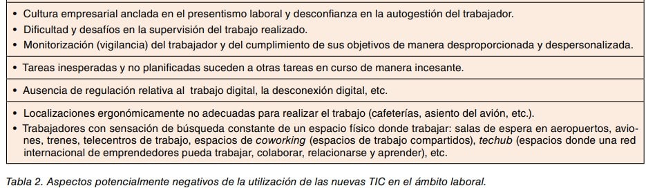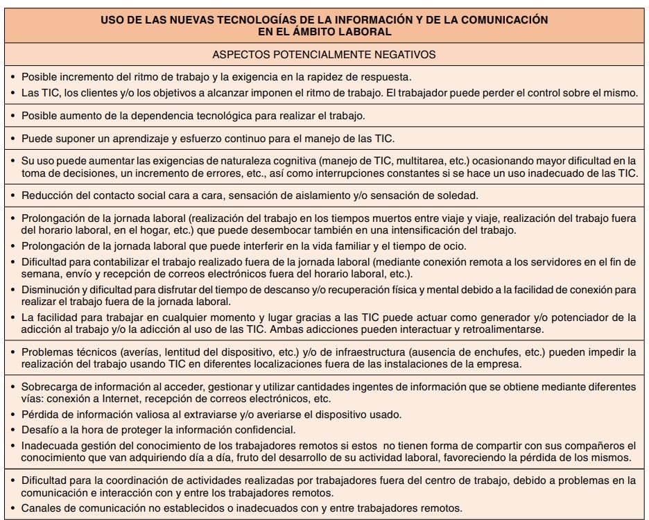 Esta cotidianidad en el uso de las TIC en el ámbito laboral está relacionada con el proceso de globalización del mercado laboral y el aumento de la competitividad, que han requerido a las empresas mayor flexibilidad en la organización del trabajo y han dado lugar a nuevas formas de organización del trabajo, diferentes a las tradicionales. Éstas suponen un desafío para los técnicos de prevención, ya que incorporan cambios en la concepción tradicional del espacio físico donde se realiza el trabajo (aumenta la deslocalización del trabajo, teniendo la opción de realizarlo en espacios públicos de coworking, en lugares de paso como cafeterías y hoteles, en medios de transporte mientras el trabajador se desplaza, etc.) y en los tiempos de trabajo (impulsando la autogestión del trabajo por parte del trabajador) con el riesgo de prolongar la jornada laboral debido a la facilidad para la conexión en cualquier momento y lugar, incidiendo así en la conciliación de la vida laboral, personal y familiar. Tal es la importancia de este asunto que se está empezando a debatir la necesidad de contemplar el derecho a la desconexión digital en la legislación laboral, existiendo empresas que ya lo están recogiendo en sus convenios colectivos.