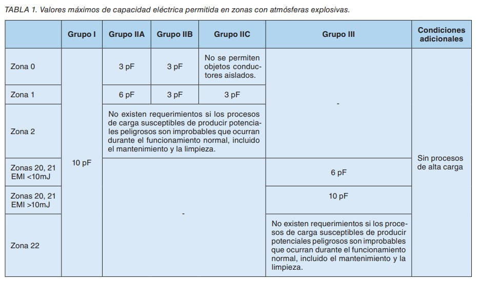 Si existen pequeñas partes conductoras aisladas en el calzado deberá cumplir las limitaciones de capacidad eléctrica recogidas en la tabla 1.