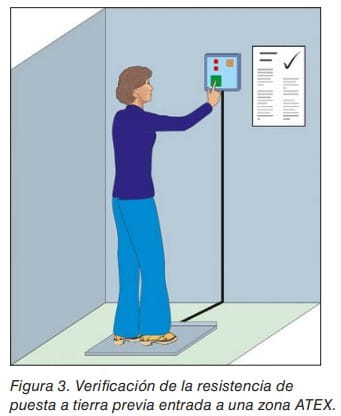 Existen equipos para la verificación de la resistencia de puesta a tierra entre la persona y la suela de su calzado (por lo general, el valor 100 MΩ debe ser el límite máximo aceptable para dicho equipo). Se recomienda hacer estas verificaciones previamente a la entrada de las áreas con riesgo de explosión, de modo que los trabajadores puedan comprobar la resistencia de su calzado antes de entrar en ella. Si los trabajadores deben llevar guantes, su resistencia también se ha de verificar; se llevará a cabo separadamente, para guantes y para calzado. (Ver figura 3).