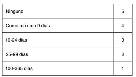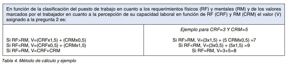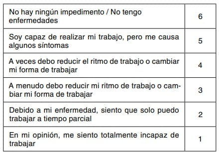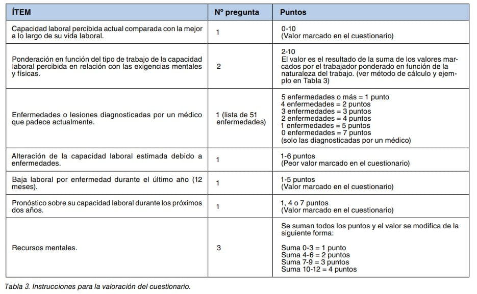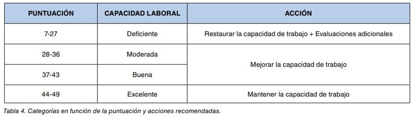 Las puntuaciones posibles van desde 7 (peor capacidad laboral) hasta 49 (mejor capacidad laboral), permitiendo clasificar al trabajador en una de las categorías especificadas en las Tabla 4. En función de la categoría, se deberán tomar medidas dirigidas a restaurar, mejorar o mantener la capacidad de trabajo.