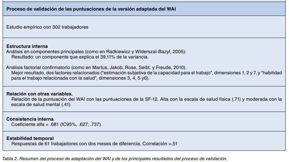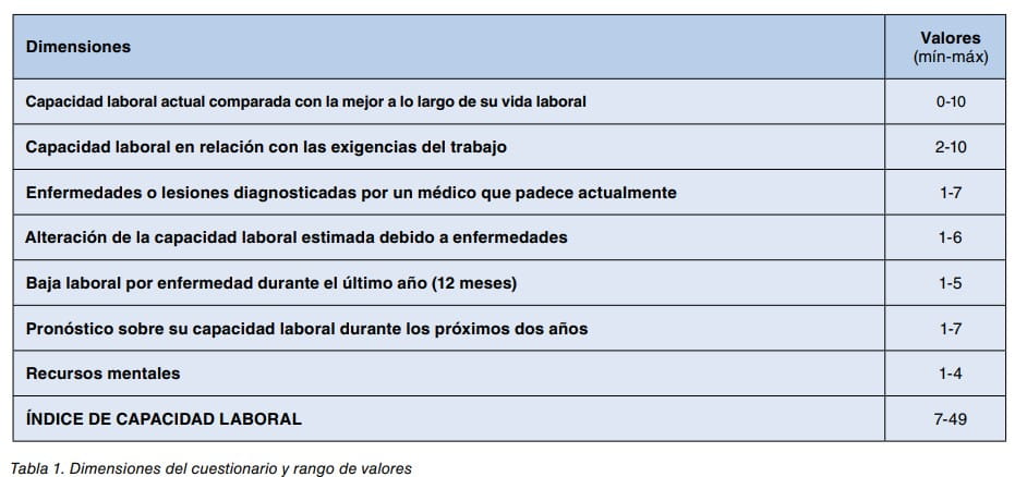 Desde su desarrollo en los años 80, el WAI es y ha sido utilizado extensamente a nivel internacional siendo traducido a 24 idiomas. Se ha mostrado válido en lo relativo a la predictibilidad con relación a la incapacidad laboral, la calidad de vida después de la jubilación, la mortalidad y la reintegración laboral positiva. Está compuesto por siete dimensiones con un total de once preguntas y permite clasificar a los trabajadores en cuatro categorías de más a menos capacidad laboral percibida. En la tabla 1 se especifican esas dimensiones y el rango de valores de cada una de ellas así como el rango para el índice en sí, que se calcula a partir de las instrucciones especificadas en la tablas 3 y 4.