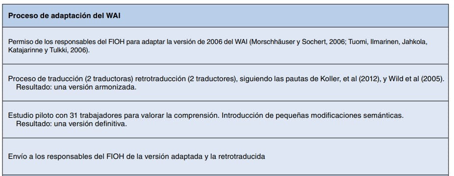 La tabla 2 presenta, de forma resumida, las principales etapas del proceso de adaptación al castellano del WAI y también los resultados obtenidos en los estudios de validación.