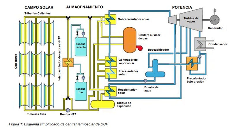 La figura 1 es un esquema simplificado del funcionamiento de una central termosolar de CCP, sin tener en cuenta los sistemas de recuperación del HTF.