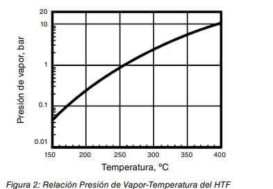 La presión de vapor de la mezcla a 25ºC es prácticamente cero (0,025 mmHg 3·10-5 bar a 25ºC), pero, en el rango de temperaturas de trabajo, la presión de vapor oscila entre los 2,6 bares y los 10,6 bares (Ver figura 2). Por tanto, para que la mezcla se presente siempre en fase líquida y circule por los conductos, la presión debe mantenerse siempre por encima de lo indicado anteriormente.