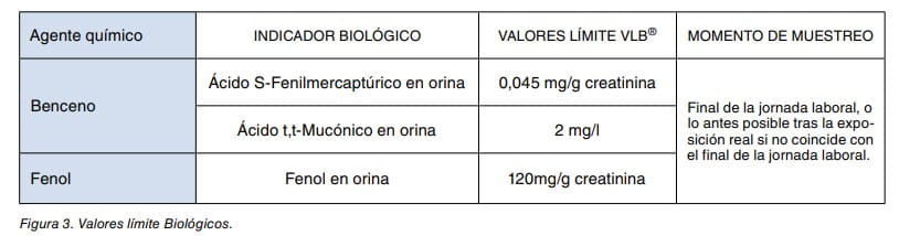 Además de las mediciones ambientales, también es básico realizar controles biológicos de exposición a benceno y fenol. La NTP 486 titulada “Evaluación de la exposición a benceno: control ambiental y biológico” indica posibles métodos ambientales y biológicos a seguir, ya que tanto el benceno como el fenol tienen VLB®, los mostrados en la figura 3.