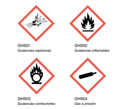 Y para completar los posibles riesgos, se añaden los pictogramas GS01 por la posibilidad de causar una explosión, GS03 por la posibilidad de causar o intensificar un incendio o explosión, y el GS04 por ser gas bajo presión que puede explotar cuando se calienta. La figura 4 muestra estos pictogramas.