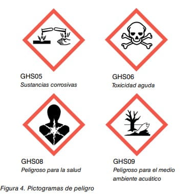 También, hay que añadir los pictogramas GHS05 y GHS06, con la palabra de advertencia “Peligro”, debido a la posible presencia de fenol, que además es tóxico y provoca quemaduras graves.