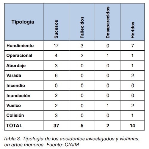 El hundimiento es el tipo de accidente más frecuente. De los 37 accidentes investigados en artes menores, 17 fueron hundimientos (46%), causando tres fallecidos y siete heridos.