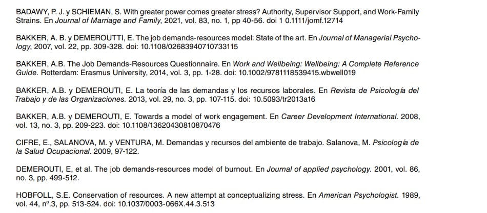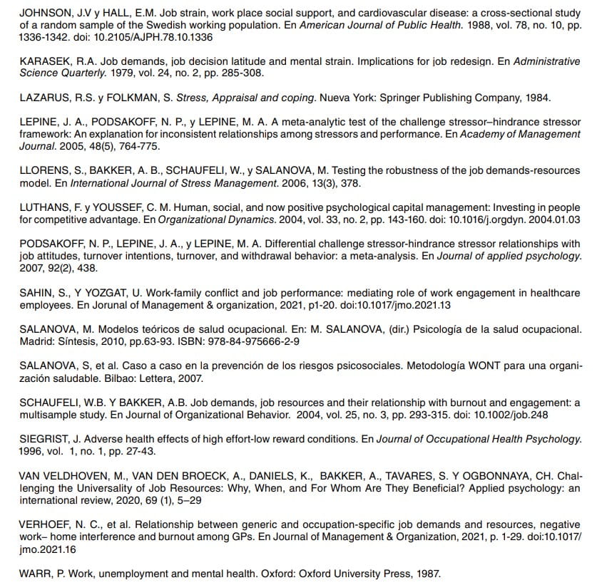 Es necesario destacar que, a pesar de que el modelo DRL no incluye explícitamente las demandas y recursos extra-organizativas, la literatura señala que se deducen de forma implícita del modelo al considerarse en el mismo una lista no exhaustiva de demandas y recursos y, por ello, se deberían tener en cuenta en la práctica de la gestión psicosocial encuadrada en este modelo (Badawy y Schieman, 2021; Verhoef, Ruiter, Blomme y Curfs, 2021; Sahin y Yozgat, 2021). Por ejemplo, las demandas familiares y su interacción con las demandas laborales pueden dar lugar a un conflicto familia-trabajo (interferencia de la familia con el trabajo) o a un conflicto trabajo-familia (interferencia del trabajo con la familia). La investigación ha puesto de manifiesto que este último tiene una mayor incidencia debido a que la familia es más flexible y se adapta en mayor medida a las demandas laborales que viceversa. Por otro lado, los recursos del hogar suficientes (ayuda doméstica o para el cuidado de personas dependientes, etc.) se asocian con un efecto positivo que facilita el funcionamiento en el ámbito laboral.