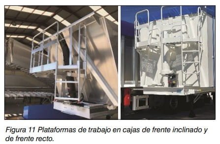 En los frentes de los semirremolques habitualmente se montan plataformas de trabajo o balcones (véase, figura 11) para la manipulación de lonas y verificación de cargas, que pueden cambiar su forma y tamaño dependiendo del tipo de frente de caja. Estas plataformas de trabajo constan de un piso de rejilla, una barandilla perimetral, un rodapié y una escala de acceso vertical.
