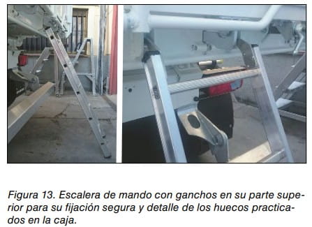 En los laterales de la caja se montan, aunque están cayendo en desuso, escalas verticales fijas con el mismo fin, y en la parte trasera puede haber una escala escamoteable (extraíbles), o bien algún peldaño aprovechando la barra antiempotramiento, para el acceso al interior de la caja de carga (véase, figura 12). Las escalas construidas a base de peldaños soldados a la caja, y que no disponen de montantes laterales, pueden presentar un riesgo de deslizamiento por el lateral.