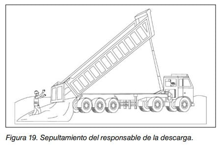 - sepultamiento por la carga del conductor/a o del responsable de la descarga (véase, figura 19) al intervenir en la zona trasera durante la basculación (ayudar a que salga el material, dirigir la descarga);