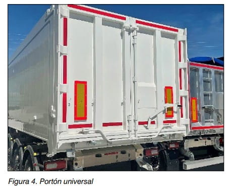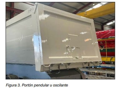 El portón de apertura hidráulica (véase, figura 5) en esencia es un portón oscilante accionado hidráulicamente por dos cilindros que elevan el portón sin necesidad de bascular la caja de carga.