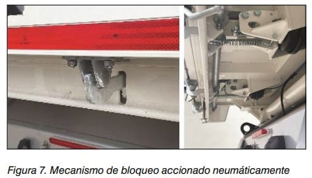 Para el bloqueo de los portones una vez cerrados existen varias alternativas, como pueden ser los cerrojos manuales (véase, figura 6), los mecanismos que actúan de forma automática con la basculación y los mecanismos accionados neumática (véase, figura 7) o hidráulicamente.