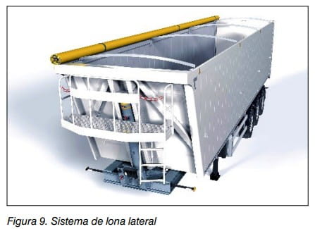 El sistema lateral (véase, figura 9) consiste en una lona sujeta de forma permanente a uno de los laterales de la caja de carga y una barra longitudinal en el otro extremo de la lona a todo lo largo que sirve para enrollar la lona sobre sí misma. Para la manipulación de este sistema de lona, se hace imprescindible una plataforma delantera o balcón en el frente de la caja (véase el punto f)).
