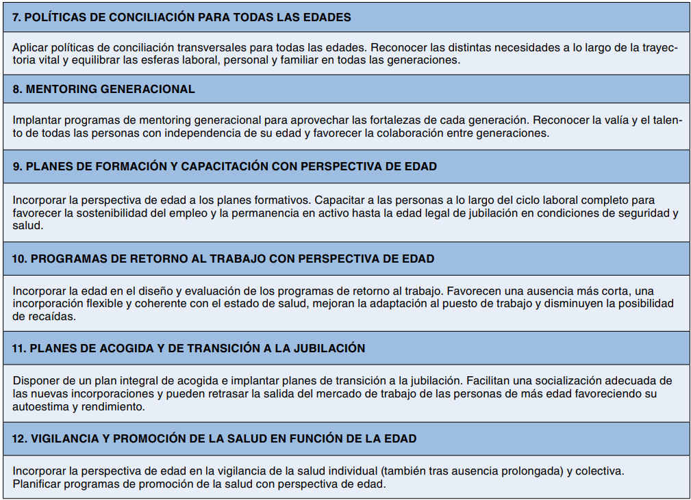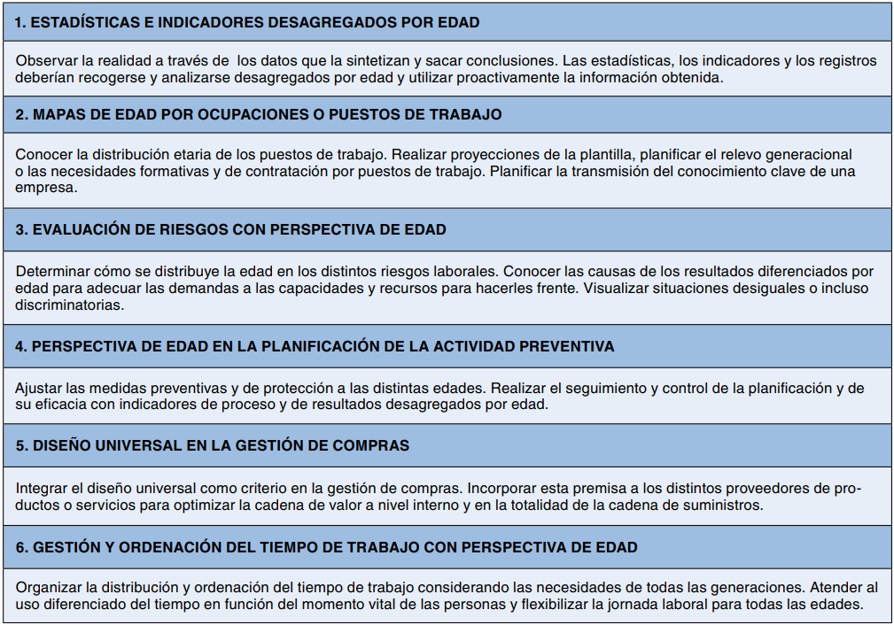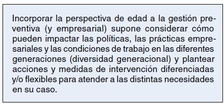 En definitiva, supone incorporar la perspectiva de edad al Plan de prevención de riesgos laborales (a la evaluación de riesgos y a la planificación de la actividad preventiva), lo que garantizará su integración a nivel empresarial considerando todas las necesidades.