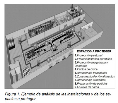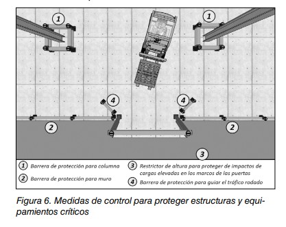- Estableciendo una distancia de seguridad adecuada entre las vías de circulación de vehículos y las estructuras o equipamiento críticos (p. ej: columnas, guías de puertas rápidas, bocas de incendio, maquinaria expuesta a la circulación de vehículos, muros panelados, tanques de almacenamiento de productos químicos, etc.).