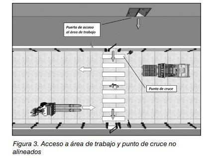 - No alinear los accesos a las áreas de trabajo con puntos de cruce. Esto reducirá la probabilidad de que los peatones los atraviesen sin observar su entorno (ver figura 3).