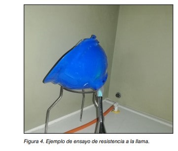 - Resistencia a la llama: Los materiales que componen el casco (casquete, sistema de retención y accesorios y dispositivos de protección no integrales adicionales) no deben arder con emisión de llama, después de haber transcurrido un período de 5 s desde que se retira dicha llama, la cual se aplica previamente durante 15 s en la parte del casco y durante 10 s en el caso de los componentes del sistema de retención.