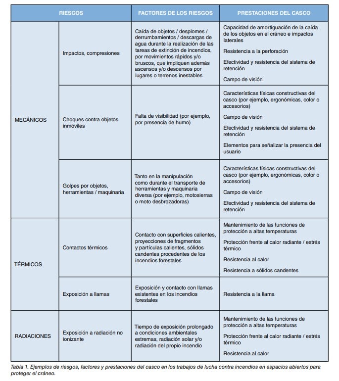 Durante la extinción de incendios forestales, la necesidad del uso del casco de protección es continuo en todas las situaciones de lucha contra el fuego, ya que los riesgos presentes durante la ejecución de las tareas propias desde el inicio de dicha extinción requieren, tal y como se puede apreciar en la tabla 1, que el casco proteja al trabajador de riesgos tales como la proyección y la caída de objetos (en desplazamientos por las masas forestales, ataque al incendio, desprendimiento de ramas, etc. ), golpes, estrés por calor, contactos eléctricos, etc.