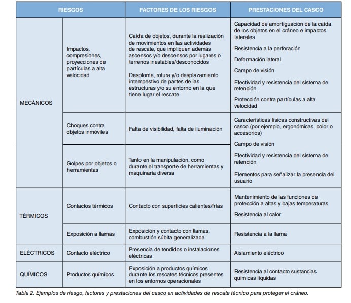 En las tablas 1 y 2 se incluyen las principales prestaciones que debe tener un casco de protección para la realización de los trabajos de lucha contra incendios en espacios abiertos y de rescate técnico con respecto a los riesgos para los que han sido diseñados.