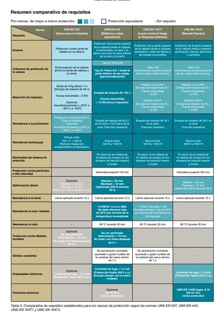 La tabla 3 ofrece una comparativa entre los requisitos establecidos en función del tipo de casco y de las tareas o actividades que se lleven a cabo con el mismo (casco para la industria, para lucha contra el fuego en edificios y otras estructuras, para lucha contra el fuego en espacios abiertos y actividades de rescate técnico).