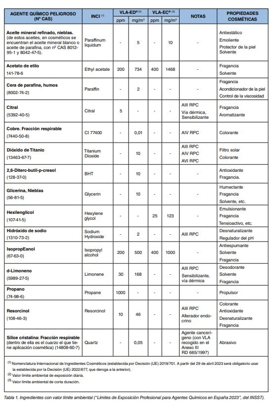 - Dispone de límite de exposición profesional (LEP), dato que facilitaría la evaluación de la exposición a dicha sustancia. La tabla 1 incluye algunos agentes químicos usados como ingredientes en productos cosméticos que tienen un valor LEP establecido en el documento del INSST Límites de Exposición Profesional para Agentes Químicos en España, indicando además sus propiedades cosméticas, y en la columna "Notas” si están sujetos a alguna restricción conforme al RPC o tienen alguna información adicional conforme al documento del INSST.