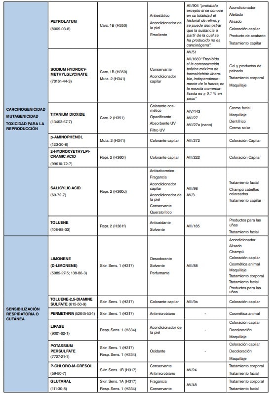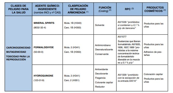 Esto hace que sea posible encontrar en los productos cosméticos sustancias químicas clasificadas como peligrosas conforme a los criterios del anexo I del Reglamento CLP, por ejemplo, CMR, sensibilizantes o irritantes. Por ello, una vez identificados los ingredientes químicos peligrosos, se deberá comprobar para cada uno de ellos sí: