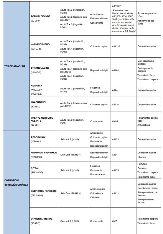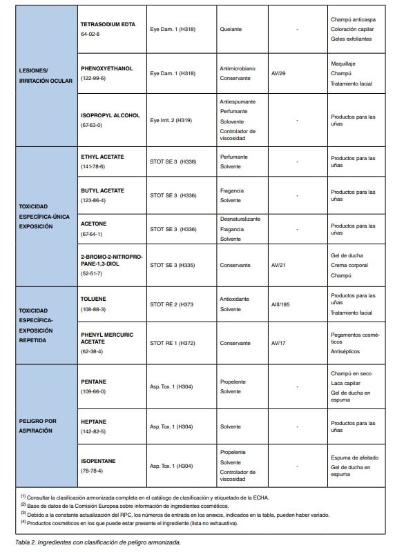 - Nanomateriales. Su uso en productos cosméticos no está prohibido, pero en la actualidad hay un estudio en marcha por parte de la Comisión Europea para revisar su peligrosidad como alteradores endocrinos, ya que se han publicado numerosos trabajos que indican que algunos materiales, en su forma nano, tienen variaciones importantes respecto de su forma no nano en relación a sus propiedades fisicoquímicas, en su forma de interaccionar con los sistemas biológicos y en sus efectos toxicológicos. En la tabla 2 se muestra un listado no exhaustivo de sustancias químicas cuyo uso está permitido como ingredientes en productos cosméticos y que están clasificadas como peligrosas por el reglamento CLP, con su clasificación de peligro armonizada establecida por la ECHA.