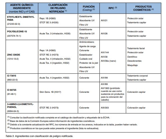 En el caso de que un ingrediente no tenga clasificación armonizada, e incluso teniéndola, es conveniente comprobar la clasificación de peligro notificada a la ECHA por los fabricantes de la sustancia. En la tabla 3 se muestran algunas sustancias cuyo uso está permitido como ingredientes en productos cosméticos y la clasificación notificada por la mayor parte de los fabricantes que han realizado dicha notificación.