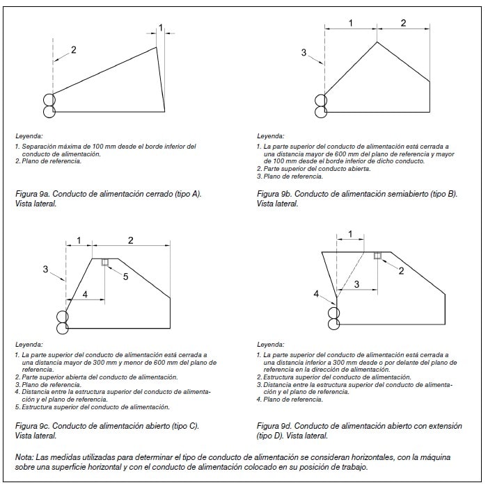 Los conductos de alimentación de los tipos C y D deben tener instalada una barrera física en la parte superior del conducto (por ejemplo, de tipo barra o viga) que conecte ambas paredes laterales (figuras 9c y 9d). Esta estructura superior debe servir de soporte al dispositivo de parada superior cuando no exista un borde superior adecuado en el conducto de alimentación para colocarlo. También puede servir de sujeción para un elemento de protección (faldón o elemento similar) que se utilice para limitar la proyección de materiales desde la máquina. El plano central de la estructura superior debe: – Estar situado a una distancia entre 590 mm y 790 mm desde el plano de referencia.