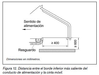 - La distancia mínima entre el borde inferior más saliente del conducto de alimentación y el primer diente de la cinta móvil debe ser 400 mm (figura 12).