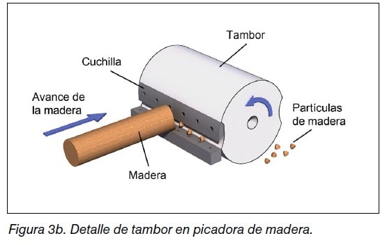 - b) Picadoras de madera tipo tambor: constan de un rotor que gira alrededor de su eje longitudinal y de cuchillas dispuestas tangencialmente.